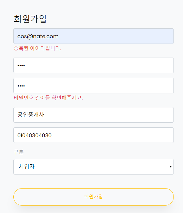 - email ์ ํจ์ฑ๊ฒ์ฌ, ์ค๋ณตํ์ธ, ๋น๋ฐ๋ฒํธ ์ผ์น์ฌ๋ถ, ๊ธธ์ดํ์ธ, ์ด๋ฆ, ์ ํ๋ฒํธ ๋ฑ์ ์ ํจ์ฑ์ ํ์ธํ์ฌ ajax๊ธฐ์ ๋ก ๋ฐ๋ก ์๋ดํ ์ ์๊ฒ ๊ตฌํ ๋์๋ค.