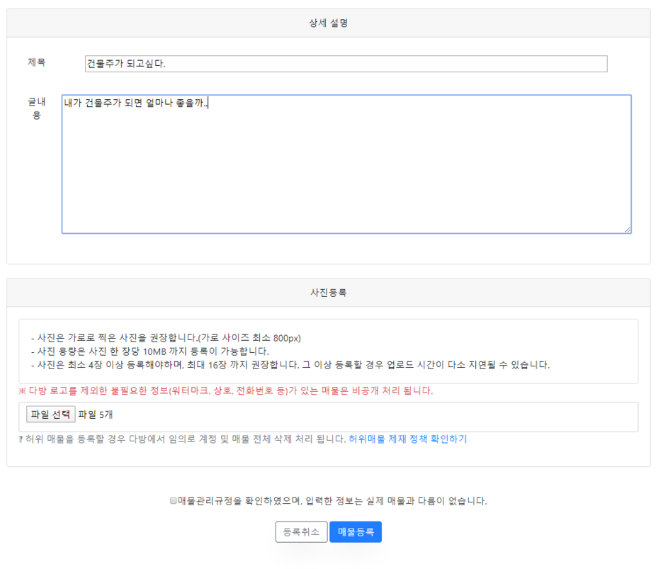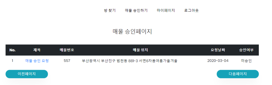 - ๋ฐฉ๋ฑ๋ก์ ํ๋ฉด ๋งค๋ฌผ์น์ธ์์ฒญ๊ธ์ด ์ฌ๋ผ๊ฐ๋ค.