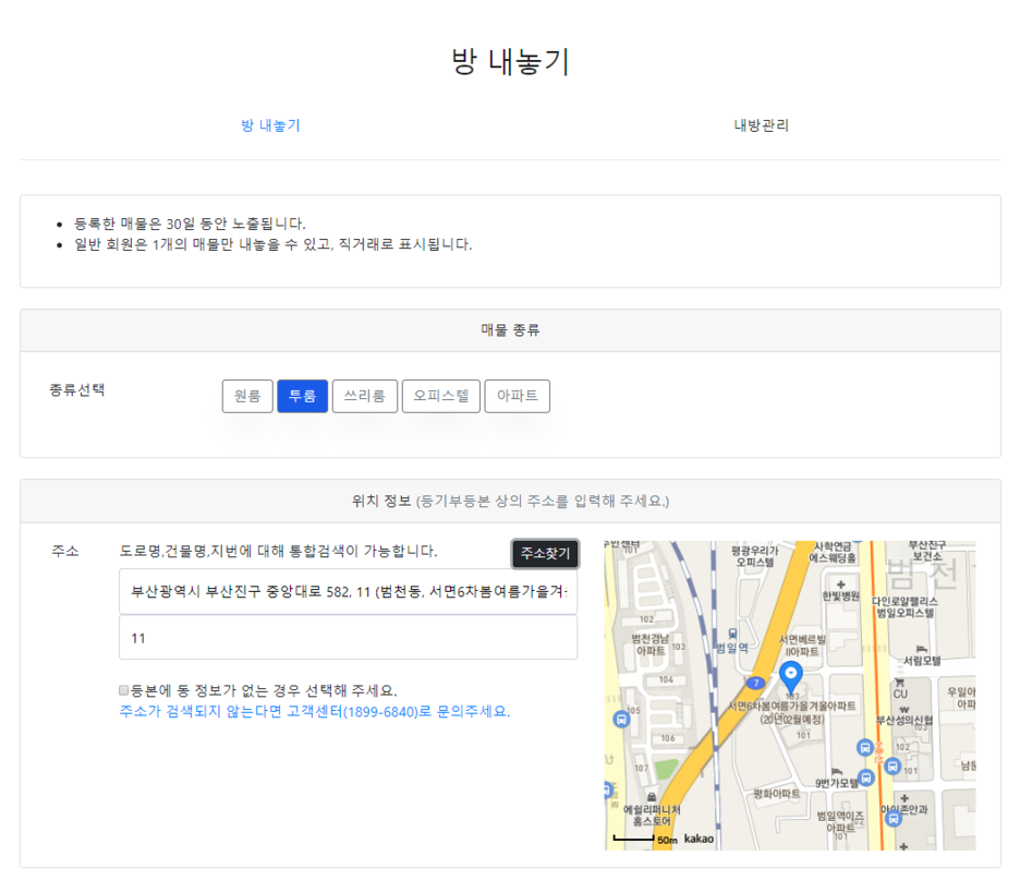 (2) ๋ฐฉ์ฃผ์ธ : ๋ฐฉ(๋งค๋ฌผ)์ ๋ฑ๋ก ํ ์ ์๋ค.