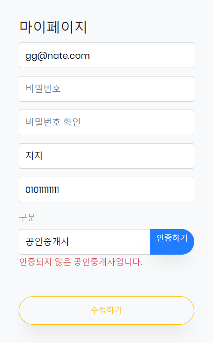- ๋ณธ์ธํ์ธ์ด ๋๋ฉด ajax๊ธฐ์ ์ ํตํด ์๋ก ๋น๋ฐ๋ฒํธ๋ฅผ ์ค์ ํ ์ ์๋ค.